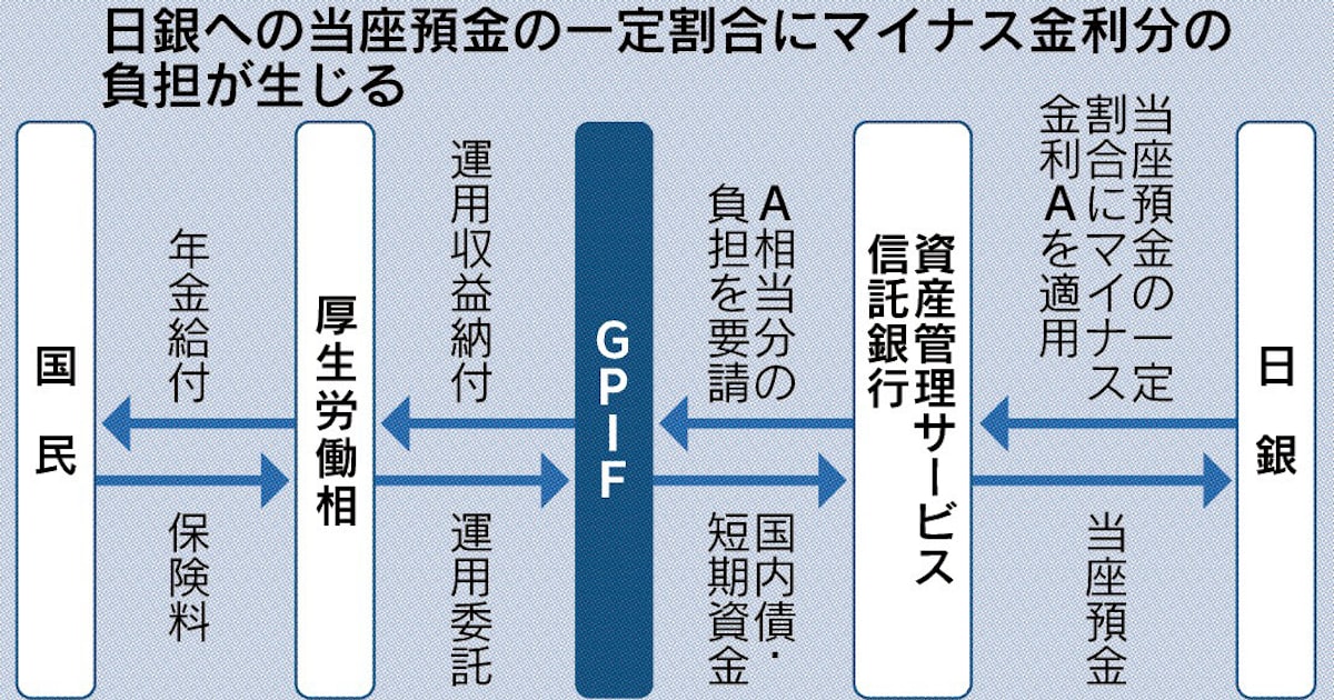 公的年金の積立金を運用する年金積立金管理運用独立行政法人(GPIF)が、預金先である信託銀行が日銀に支払うマイナス金利分を負担する案を検討していることが18日分かった。金利が下がって運用環境が厳しく、GPIFの預金が大きく膨らんだことから、信託銀が負担しきれなくなったマイナス金利分を肩代わりする。日銀が進めているマイナス金利政策の副作用が国民の年金資産にも波及した形だ。