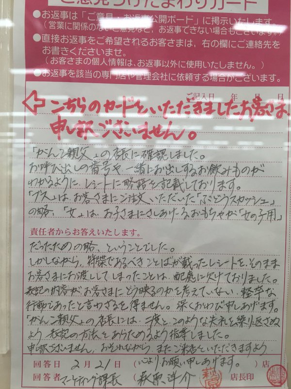 レシートに「ブス女」と書かれて激怒したら勘違いやったらしい…今日この頃。