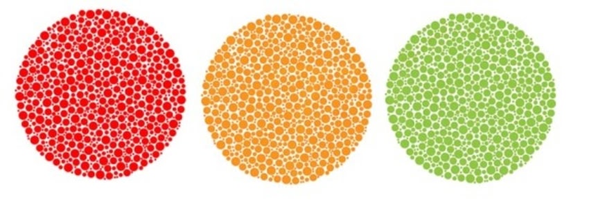 さて、上の画像を見てほしい。3つの円が赤・黄・緑と、すべて同じ色の点の集合体に見えるなら、あなたはごく普通の「3色型色覚」の持ち主だ。だが…