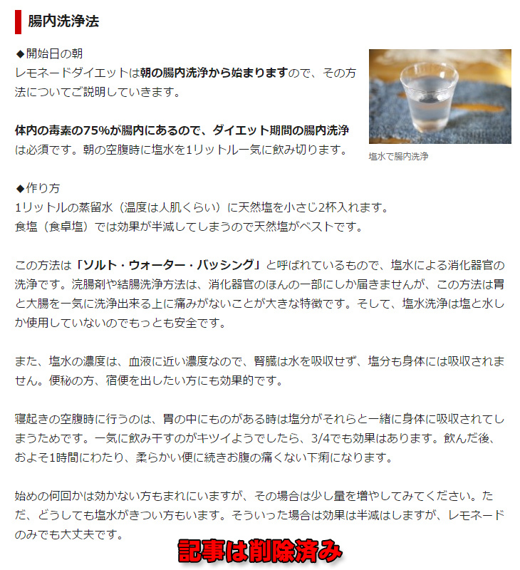 「セレブがやってる」だの「レモネードダイエット」だの「ソルト・ウォーター・パッシング」だの、もうこれだけ胡散臭過ぎるけど、要するに「生理食塩水」を飲めって事か。