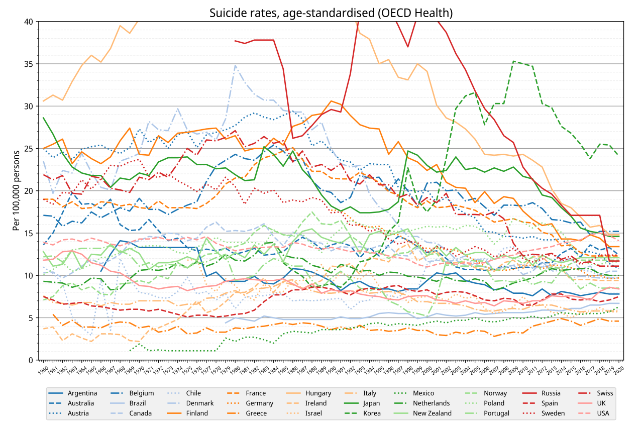 10代の虐めが原因の自殺とか長時間労働の自殺対策をするって事自体には反対せんし、むしろやるべきやと思うけど、こういうのは自殺の要因の極一部。