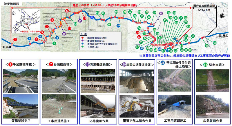 国土交通省 北海道開発局とNEXCO東日本(東日本高速道路)北海道支社は、8月30日の台風10号の影響により交通止めとなっている国道274号日勝峠(北海道沙流郡日高町千栄~上川郡清水町清水、延長39.5km)について、2017年秋頃を目標に通行止めを解除すると発表した。車両進入が困難な箇所を徒歩、自転車、ヘリコプター、ゴムボートによる渡河などにより被災状況を調査。橋梁損傷10カ所、雪崩・地吹雪対策用の覆道の損傷が3カ所、道路本体が大きく欠損した箇所が6カ所など、合計で66カ所の被災が確認された。