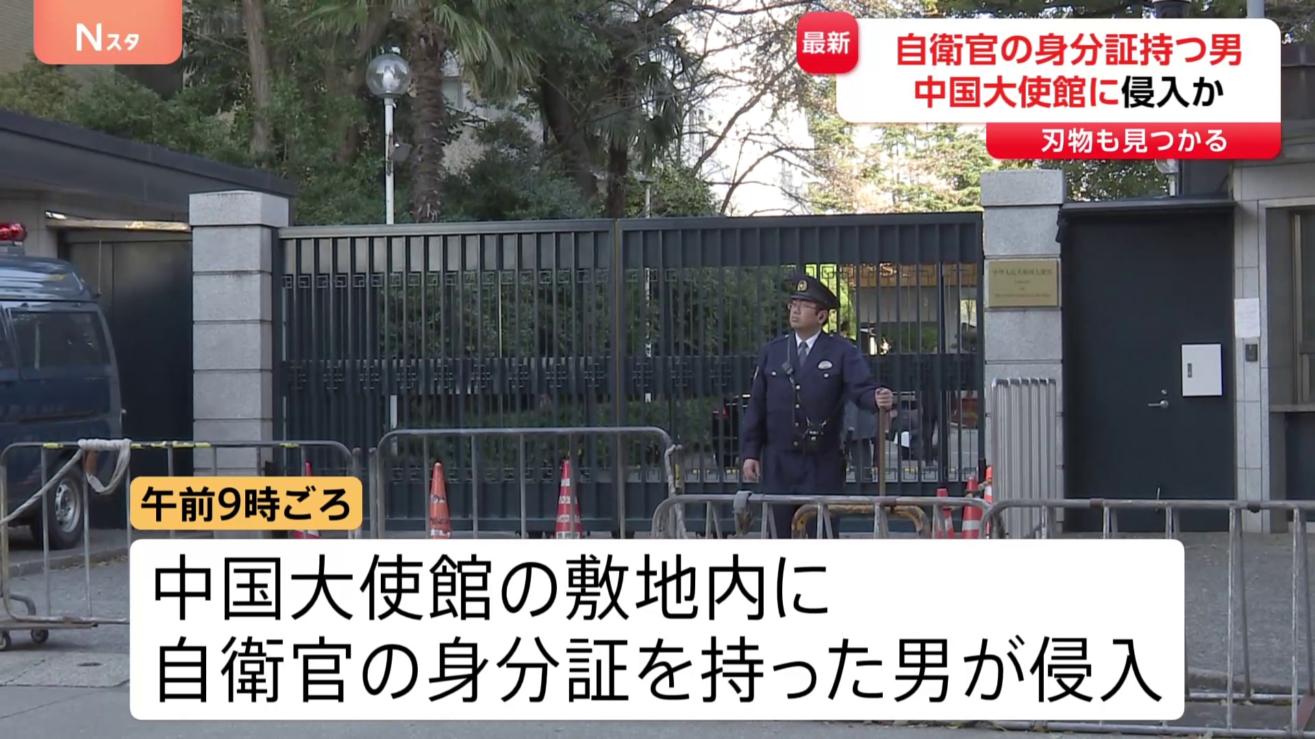 中国大使館敷地内に侵入か…自衛官の身分証持つ男を確保 敷地内で刃物1本発見 中国外務省は「厳正な申し入れを行い強く抗議」(TBS NEWS DIG Powered by JNN) - Yahoo!ニュース