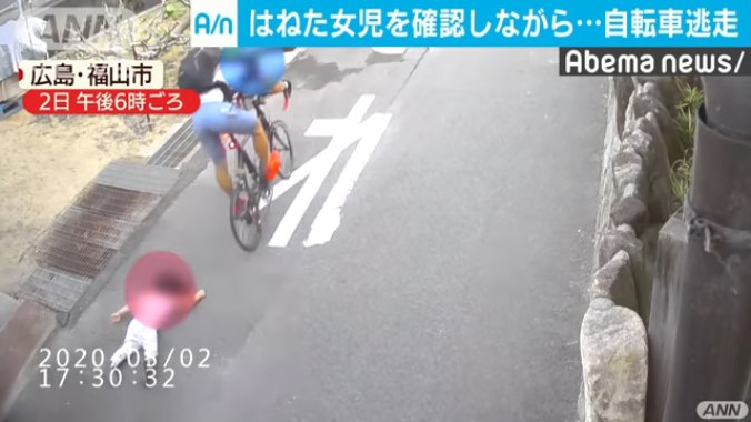 福山市神村町で3歳の女の子が(多分クロスバイク?)自転車に轢かれる映像が流れてたんだけど