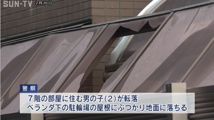 駐輪場の屋根がクッションになったとはいえ、7階から転落して命があるってのは奇跡ですな。両親ともに在宅してたけど、TVを見てて気づかんかったってのがなぁ。奇跡的に助かった命なんで、二度とこんな事が起きように大事に育てて欲しいもんですな。
