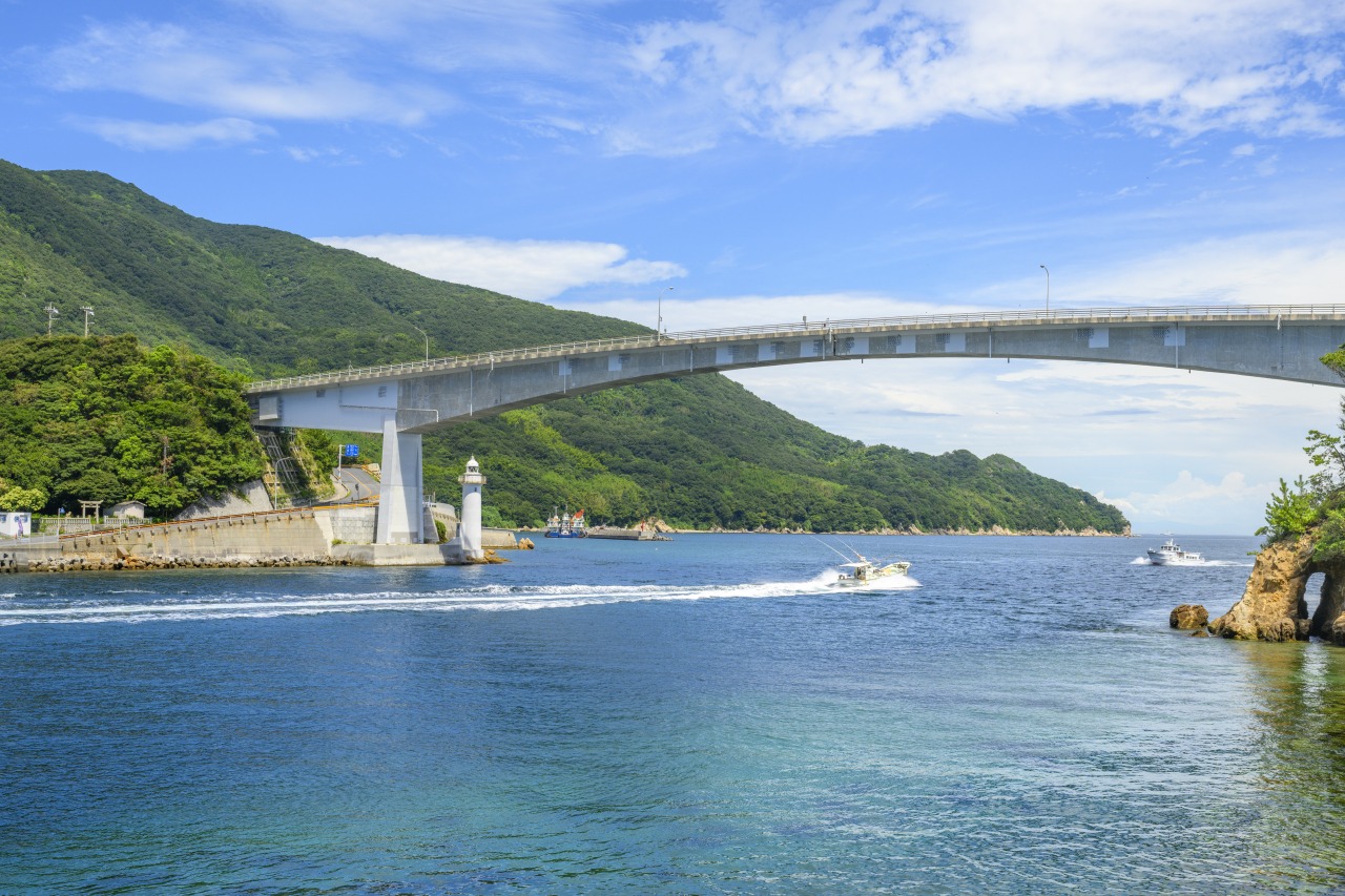 室津・上関間の海峡は170mで,昔から防長の三海関の一つに数えられており,現在でも1日約千隻の船が通過している。海峡を結ぶこの橋は,昭和44年6月に完成したもので,付近には,旧砲台跡,毛利水軍本陣跡,城山跡などの史跡がある景勝地である。