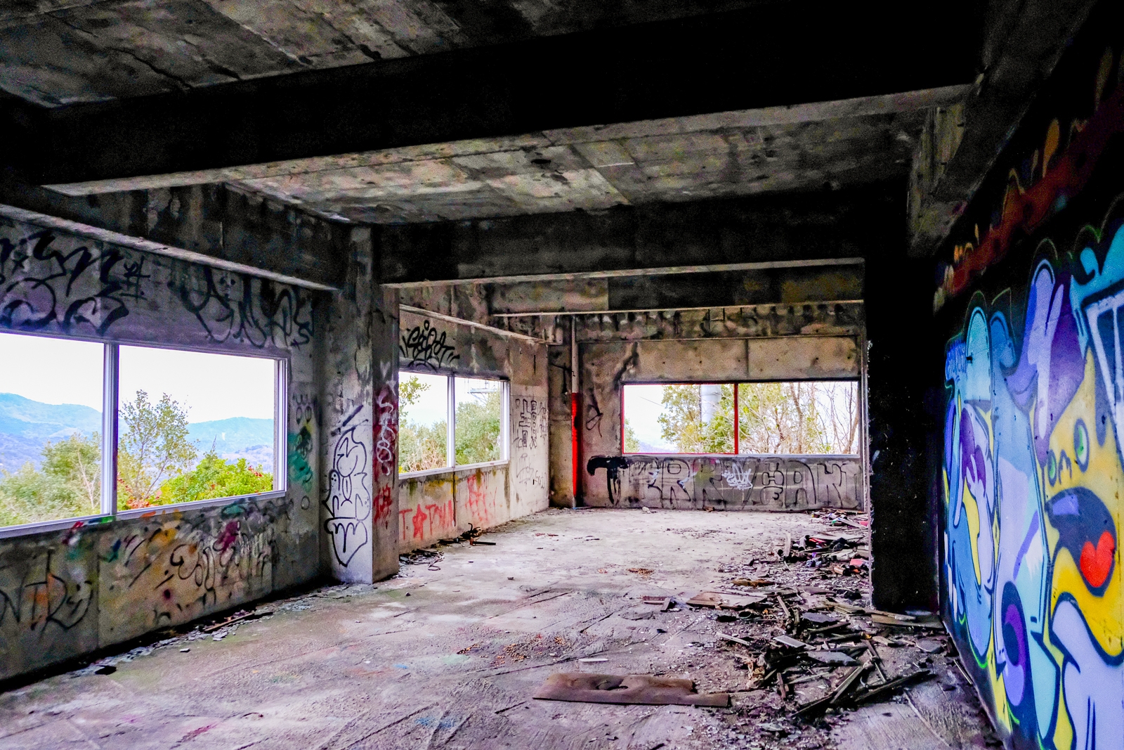 山頂を目指し車一台分程度の道幅しかない山道を登って行くと、NTTの巨大なアンテナの横にさくらの名所とは似つかわしくない落書きだらけの廃墟がある。