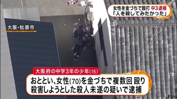 28日午前9時半ごろ、大阪府松原市南新町の長屋前の路上で、この長屋に住む無職女性(70)が男に金づちで頭を殴られた。女性は頭に重傷を負って病院に搬送されたが、命に別条はないとみられる。男はその場から逃走しており、大阪府警松原署が殺人未遂容疑で捜査している。同署によると、女性は男と面識はなく、玄関から自転車を出して自宅横の路上に置いていたところ、後ろから突然襲われた。捜査関係者によると、現場に金づちが落ちていたという。