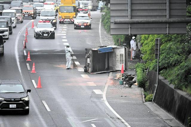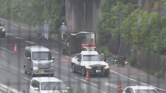 県警高速隊によると、目撃者から「上からトラックが落ちてきた」と110番通報があった。当時、トラックは同県半田市方面に向けて走行中だった。右カーブの終点近くで、左側のガードレールに衝突し、のり面を伝うようにして、約8~9メートル下の国道に転落したとみられる。
