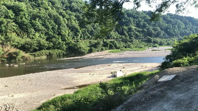 現場の川幅は広いが中央部は深く流れが強く、本流での川遊びは危険です。