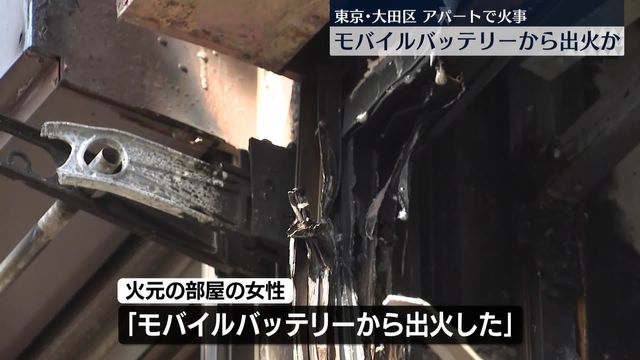東京・大田区のアパートで火事があり、女性1人がけがをしました。「モバイルバッテリーから火が出た」ということです。