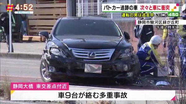 この男は9日、神奈川県の警察が別の詐欺などの疑いで逮捕し、警察によりますと「静岡市で事故を起こした」と供述しています。8日午後1時すぎ、静岡市駿河区緑が丘の市道で、パトカーに追われていた乗用車がほかの車に次々とぶつかり、あわせて8台が絡む事故を起こし、女性1人が軽いけがをしました。