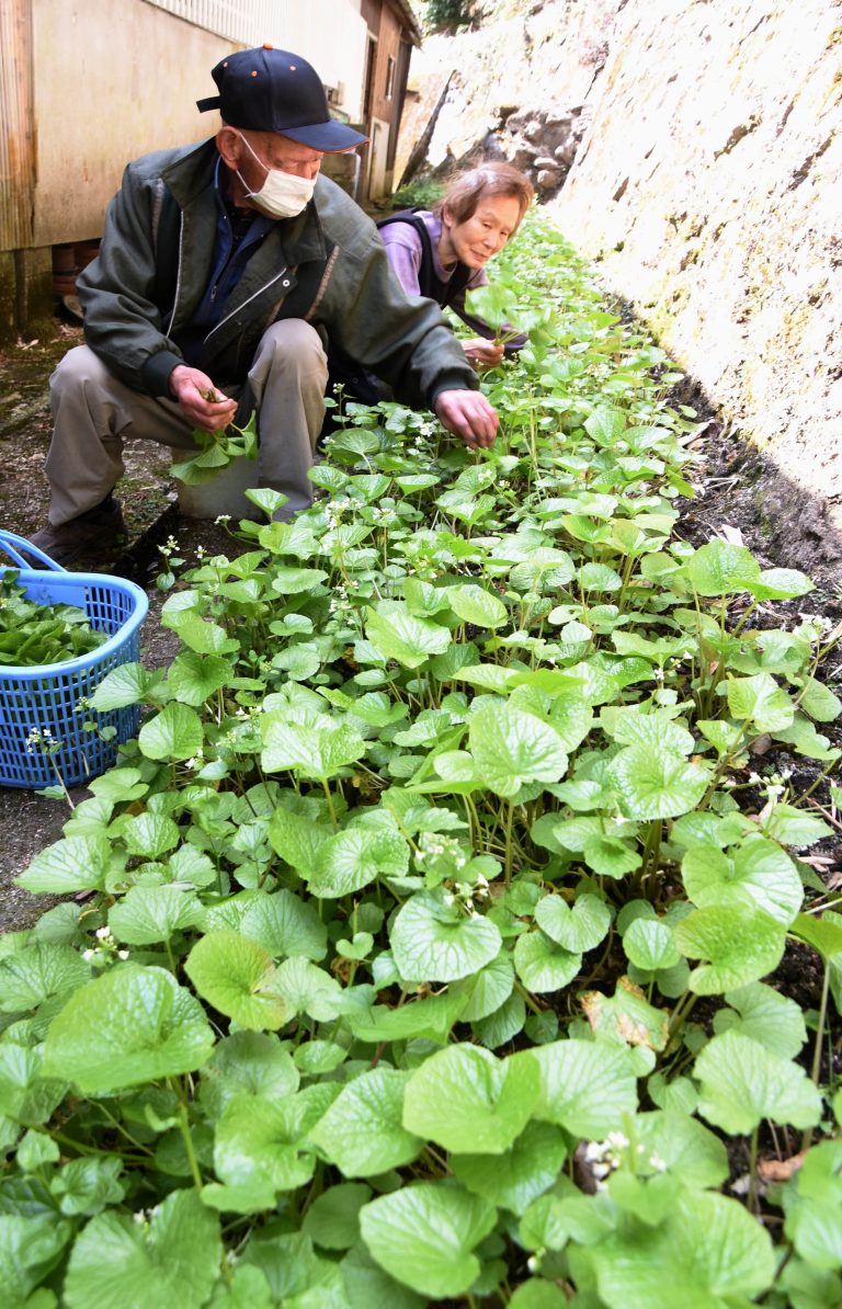 ◎…ピリッとくる辛味と風味が特徴で、春の味覚として親しまれる。栽培歴約15年という下斎原の農業・田中眸さん(87)、繁子さん(85)夫妻は、ハウス栽培の葉ワサビを3月上旬から収穫し、4月からは露地物を出荷している。青々とした葉がいっぱいに広がる中、葉と茎の部分を丁寧に摘み取り、袋詰めする。「きれいな山の湧き水に育まれ、今年も品質は上々。多くの人に山里の春を感じてもらいたい」と田中さん。